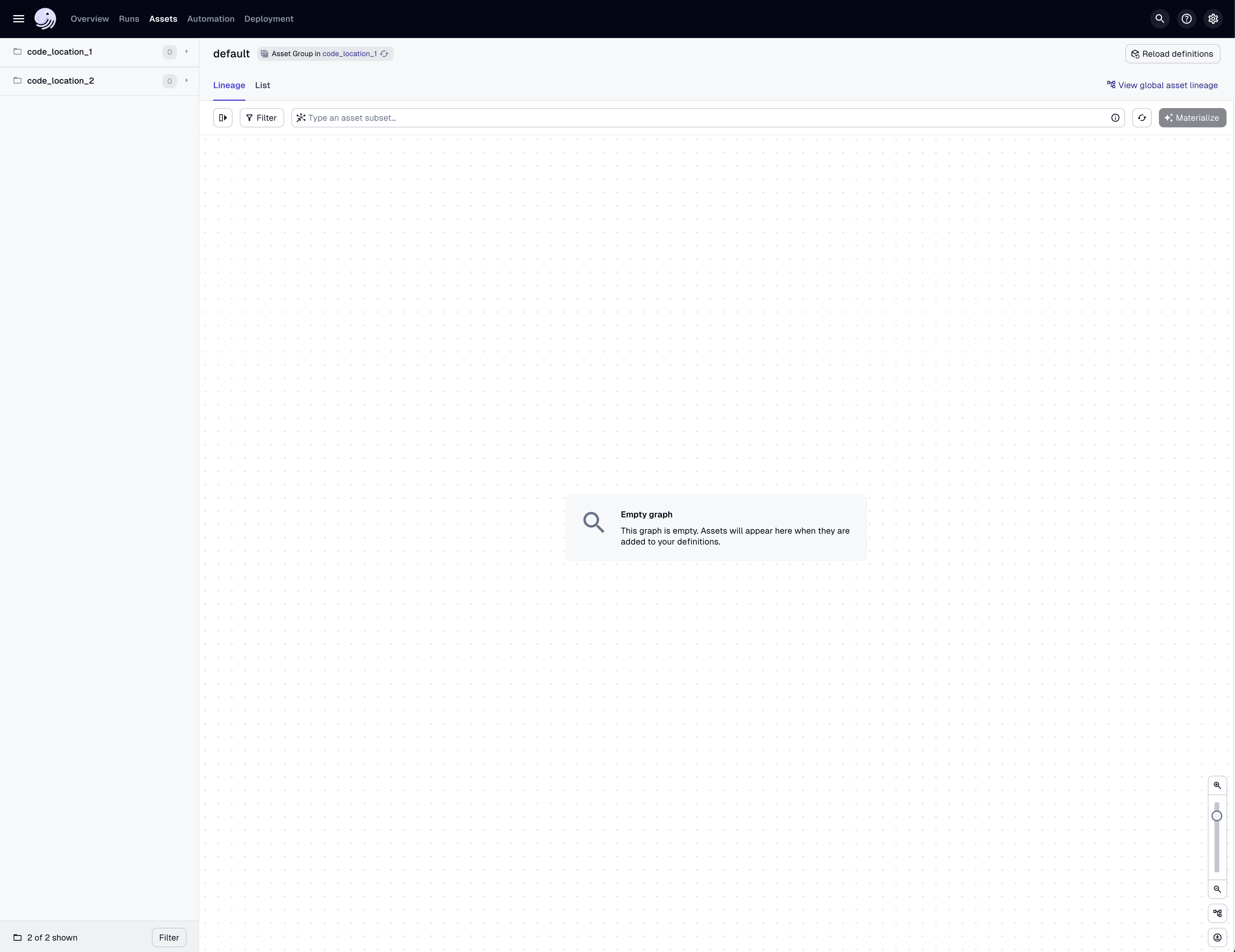 Finally, let's load up our two projects with dg dev. When we run dg dev from the workspace root, it will automatically recognize the projects in your workspace and launch each project in a separate process in its virtual environment found in the .venv folder in the project.